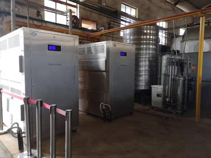 蒸汽熱源機組由2臺蒸發(fā)量為1t/h的蒸汽熱源機組成,具有自動化程度高、熱效率高、供汽速度快、設(shè)備操作簡單、占地面積較小等特點,不僅改善了現(xiàn)場作業(yè)環(huán)境,有效解決了環(huán)保、職業(yè)衛(wèi)生等問題,還實現(xiàn)了自動化、無人化生產(chǎn),滿足安全技術(shù)發(fā)展目標要求。目前該設(shè)備已投入使用,運行期間各設(shè)備運行平穩(wěn),產(chǎn)生的蒸汽壓力約0.6Mpa,到達用汽點的蒸汽壓力約0.4 Mpa左右,能夠滿足生產(chǎn)線用汽需求。