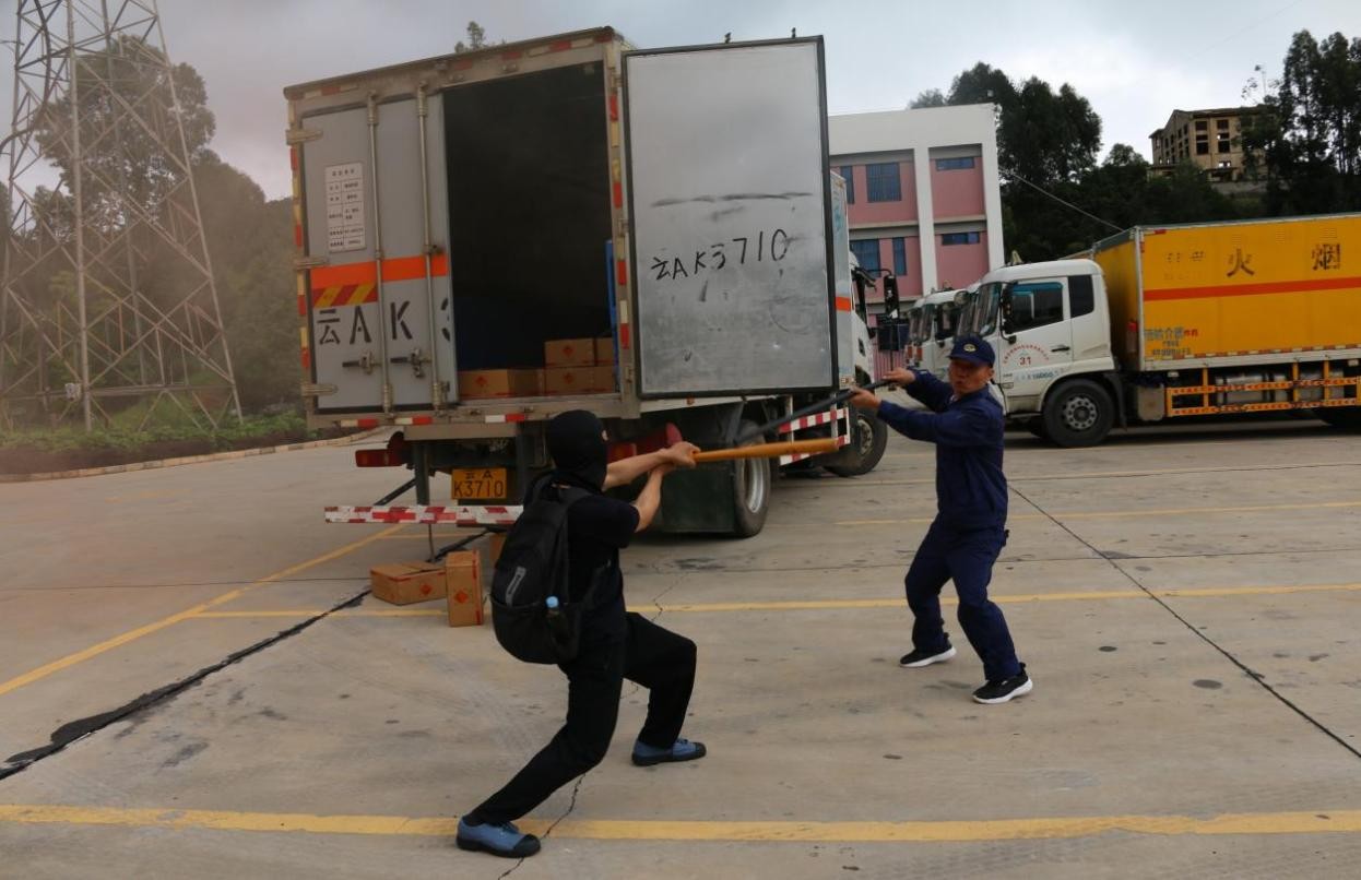 本次演練事故模擬:公司爆炸物品運(yùn)輸過程中,遭遇恐怖分子襲擊,發(fā)生車輛受損、縱火、搶奪炸藥的恐怖事件。駕駛員、押運(yùn)員在與歹徒周旋中,及時(shí)報(bào)警和報(bào)告公司后,公司立即啟動(dòng)應(yīng)急預(yù)案,各應(yīng)急小組迅速集結(jié),按照應(yīng)急預(yù)案分工協(xié)作:現(xiàn)場(chǎng)搶險(xiǎn)組根據(jù)現(xiàn)場(chǎng)情況迅速采取措施處置并指揮現(xiàn)場(chǎng)人員緊急撤離;安警戒組對(duì)周邊區(qū)域警戒隔離,禁止非應(yīng)急救援人員、車輛進(jìn)入,擔(dān)負(fù)臨時(shí)交通指揮,對(duì)“恐怖分子”實(shí)施圍堵;醫(yī)療救護(hù)組用擔(dān)架把傷員抬到“醫(yī)療現(xiàn)場(chǎng)搶救點(diǎn)”進(jìn)行救治包扎,送“醫(yī)院治療”;善后保障組將燃燒后的的煙霧彈用水熄滅降溫后送廢五金材料暫存點(diǎn)存放,將滅火器噴出的干粉收集裝袋,將空滅火器瓶收集合規(guī)處置,已被機(jī)油污染的路面用沙土吸附后用水沖洗。